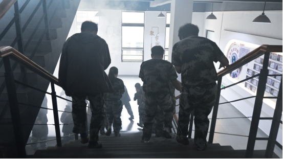 随着火警警报响起,模拟火灾现场考验正式开始。浓烟弥漫,能见度骤降,学生们迅速反应,按照所学逃生知识,捂住口鼻、低姿贴墙前行,有序撤离现场。整个过程仅用两分钟,充分展现了演练的实效性。