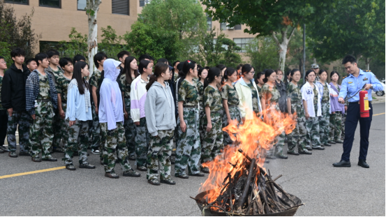 理论讲解后,课程进入实操环节。扈教官详细演示了灭火器的使用方法,并总结出“拔、握、站、压”的四字口诀。新生们在教官的指导下分组进行实操练习,通过模拟灭火操作,将理论知识转化为实际技能,显著提升了安全急救能力。