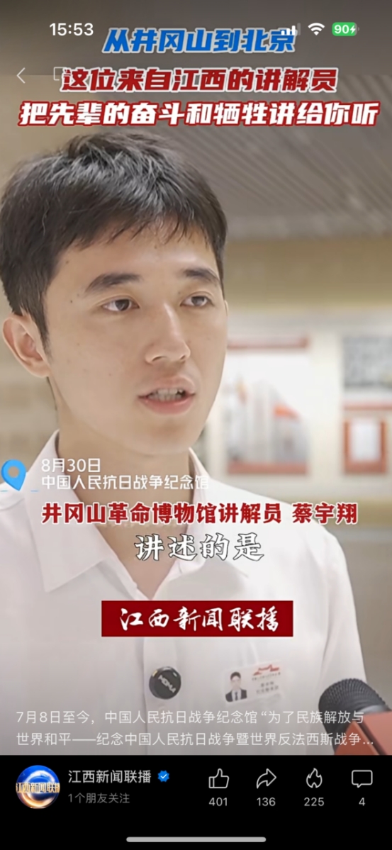在这场具有重大历史意义的纪念活动中,蔡宇翔作为井冈山革命博物馆的优秀讲解员,被选派至中国人民抗日战争纪念馆,参与“为了民族解放与世界和平——纪念中国人民抗日战争暨世界反法西斯战争胜利80周年主题展览”的讲解工作。他以专业的素养和富有感染力的讲述,生动传递了伟大的抗战精神。