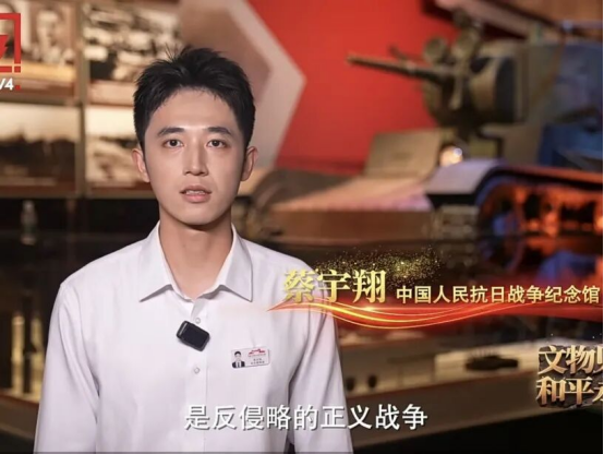 同时,蔡宇翔还参加了中央广播电视总台中文国际频道(CCTV-4)推出的系列纪录片《文物见证·和平永续》的录制。该片通过文物与历史叙事相结合的方式,全景式回顾中国抗日战争的艰辛历程,深刻展现中国人民的家国情怀与民族精神。